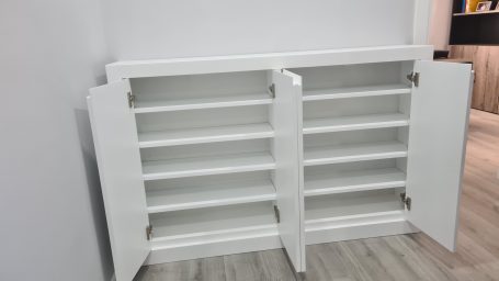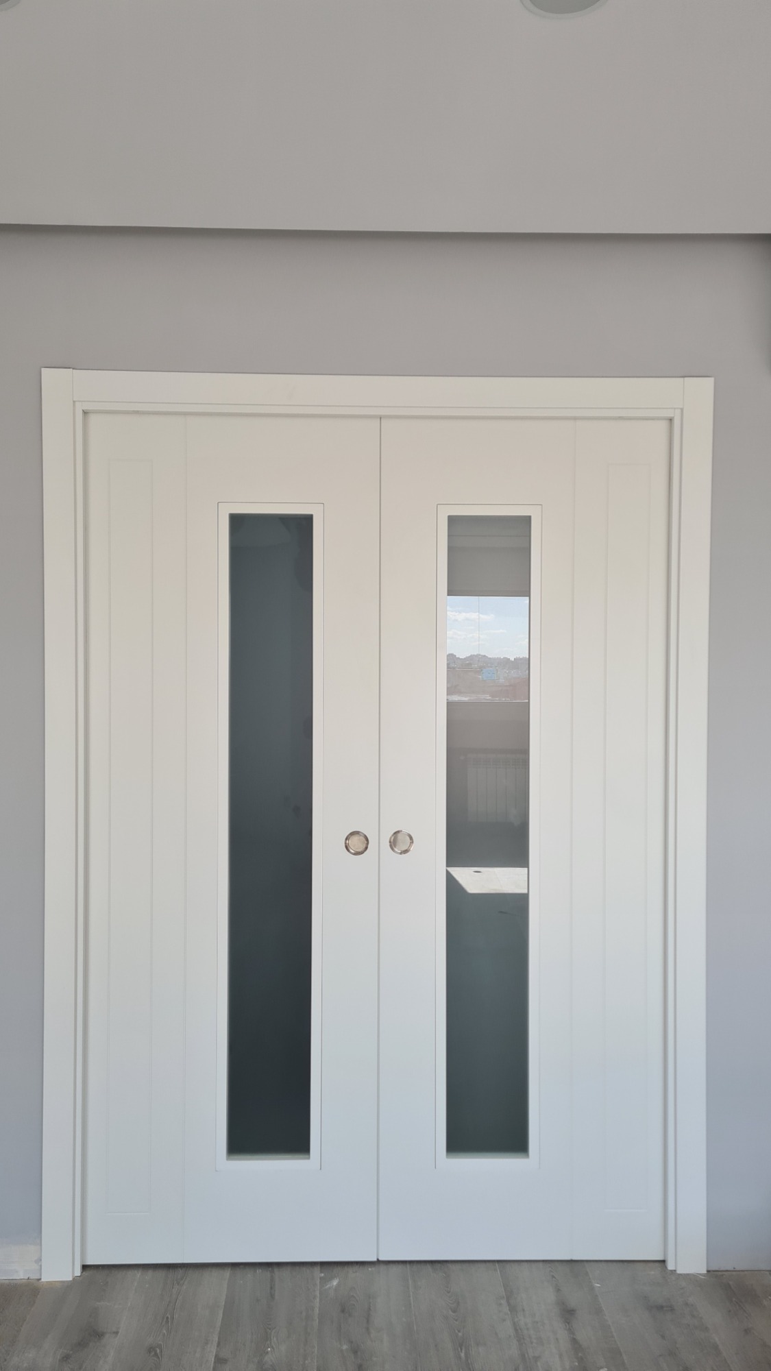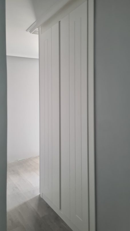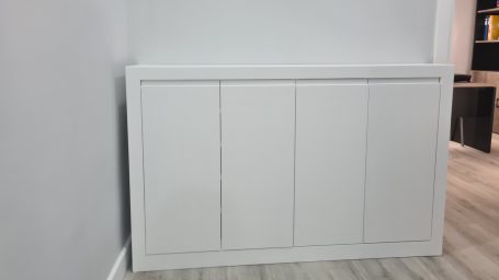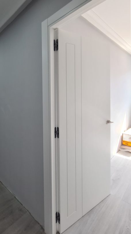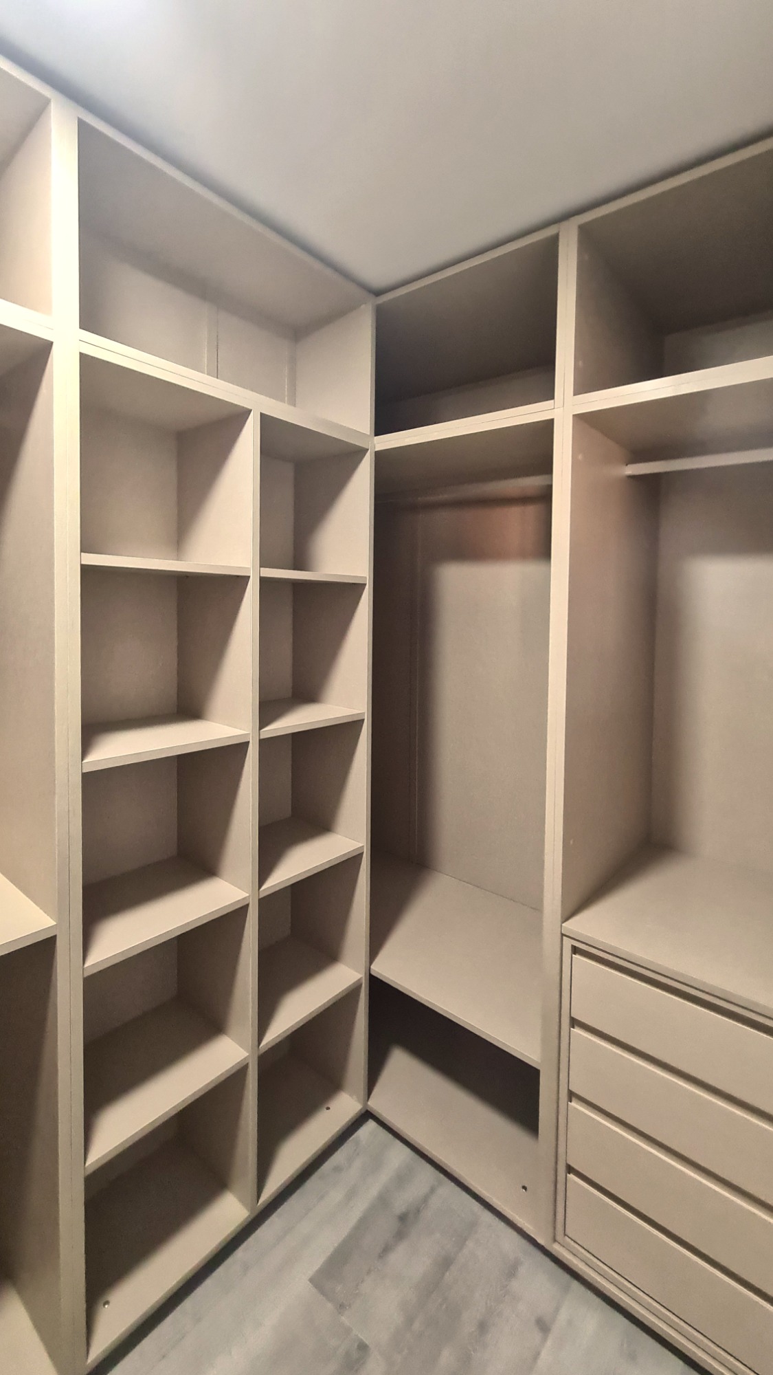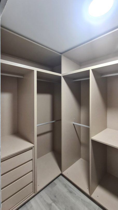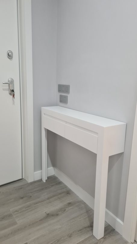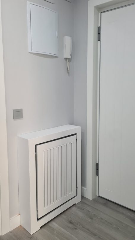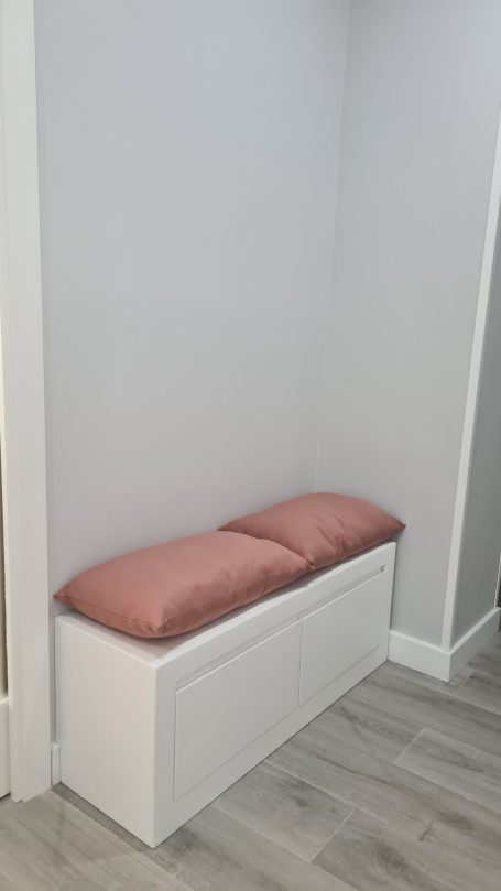 En esta obra se combinaron los fondos y las alturas de los armarios, para su máximo aprovechamiento. Los armarios del pasillo y las habitaciones, se hicieron coincidir a los dos lados, es decir sin tabique intermedio, con lo que conseguimos eliminar perdida de espacio.